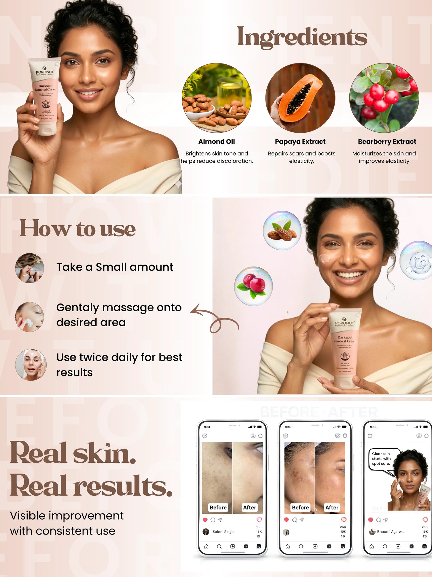 Formulated with powerful brightening agents and nourishing ingredients, this dark spot removal cream effectively targets pigmentation, fades black spots on the face, and restores your skin’s natural radiance. Unlike harsh chemical treatments, POKONUT’s best dark spot removal cream is enriched with skin-loving botanicals that work gently yet effectively to give you a flawless, even complexion.