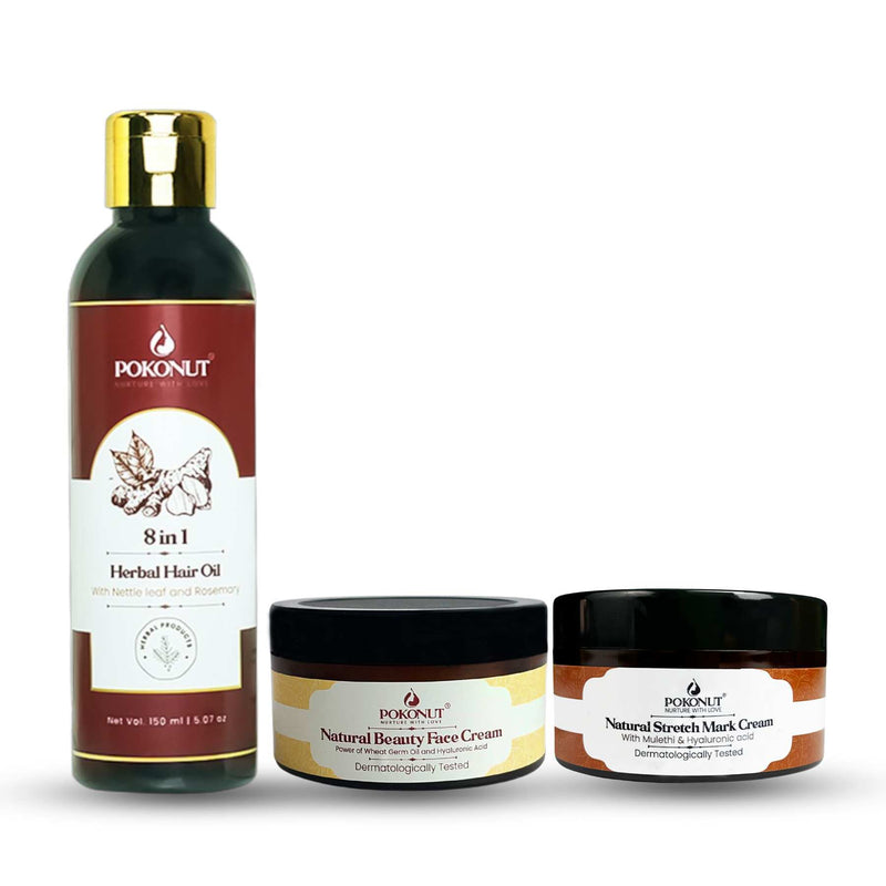 Pokonut Premium Herbal Ayurveda Skin Care Kit is made from natural and organic ingredients that are thought to be beneficial for the skin and hair.